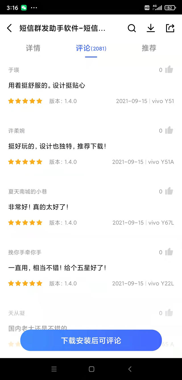 短信操作也簡單,十分方便。就像這款紅楓葉傳媒開發(fā)的群發(fā)短信平臺APP,不用上傳通訊錄,就能群發(fā)通訊錄好友,只要把自己發(fā)送的內(nèi)容編輯好,一次可以群發(fā)上百或上千號碼,十分鐘就能搞定群發(fā)短信。安quan問題我也不用擔(dān)心,紅楓葉傳媒是獲工信部頒發(fā)SP證的單位,注冊資金1000萬,資質(zhì)齊全,做了十多年了,可靠放心。這款A(yù)PP在安卓、蘋果應(yīng)用商店都能下載,換手機也不用怕!
